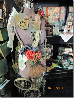 Since we decided to go into the Quilt Market, we have passed on going to CHA Summer Show since it’s a much smaller show than the Winter one. My friend, Diane from Graphic 45 asked me if I would help her some fun projects for her booth (she knows I like junk and metal). So I designed the dress form for the Steampunk Debutant line. That girl was one “heavy metal” lady!