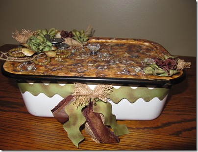 I sprayed the tri-arm and handle with taupe metallic spray paint and let it dry. I then took some brown spray paint and added little touches of it. I thought the colors went well with the fun paper.