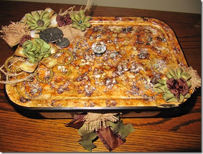 I took some beads from an old antique necklace and added them to Tim’s Swivel Clasps and Type Charms. Around the ring I hung three Philosophy Tags, Added some antique ribbon in a few places and hung up Tim’s products.